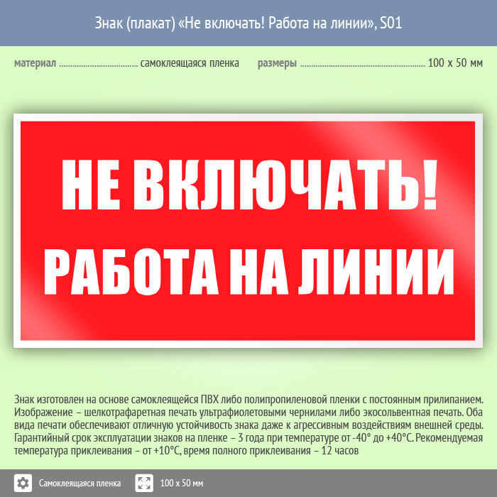 Знак (плакат) «Не включать! Работа на линии», S01 (пленка, 100х50 мм) в Нижнекамске купить