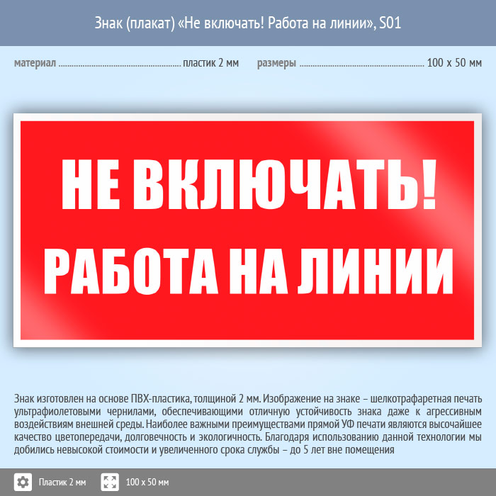 Знак (плакат) «Не включать! Работа на линии», S01 (пластик, 100х50 мм) в Нижнекамске купить