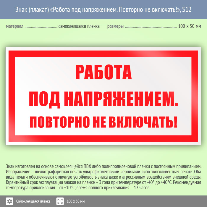 Знак (плакат) «Работа под напряжением. Повторно не включать!», S12 (пленка, 100х50 мм) в Нижнекамске купить