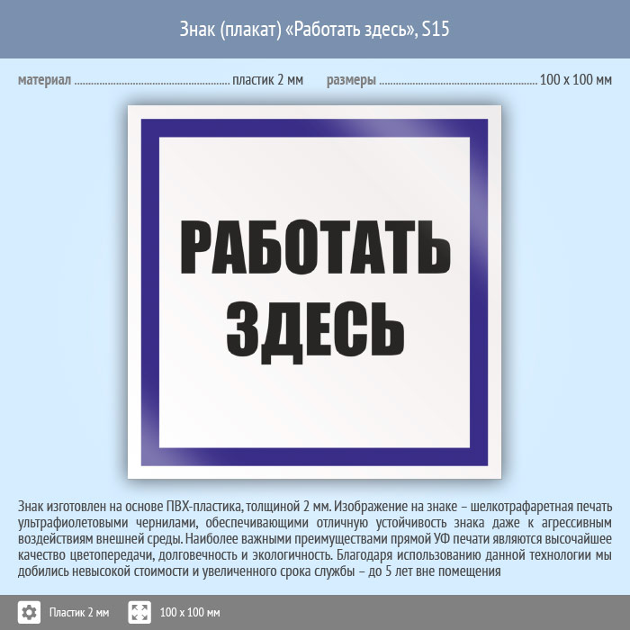 Знак (плакат) «Работать здесь», S15 (пластик, 100х100 мм) в Нижнекамске купить
