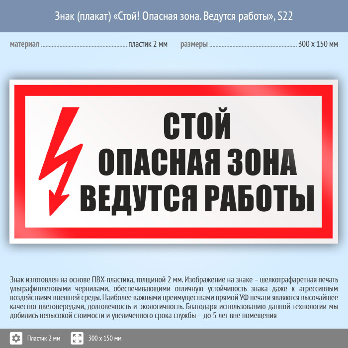 Знак (плакат) «Стой! Опасная зона. Ведутся работы», S22 (пластик, 300х150 мм) в Нижнекамске купить