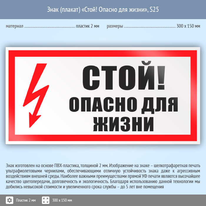 Знак (плакат) «Стой! Опасно для жизни», S25 (пластик, 300х150 мм) в Нижнекамске купить