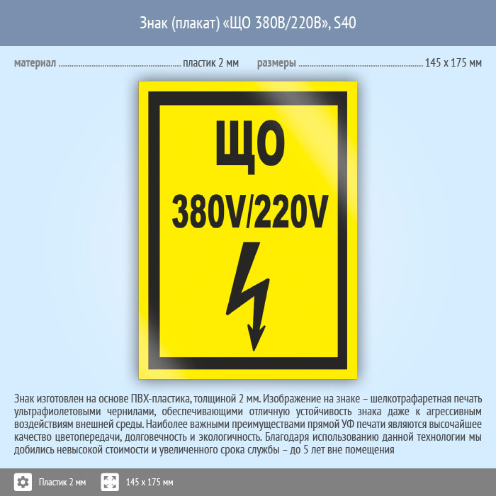 Знак (плакат) «ЩО 380В/220В», S40 (пластик, 145х175 мм) в Нижнекамске купить