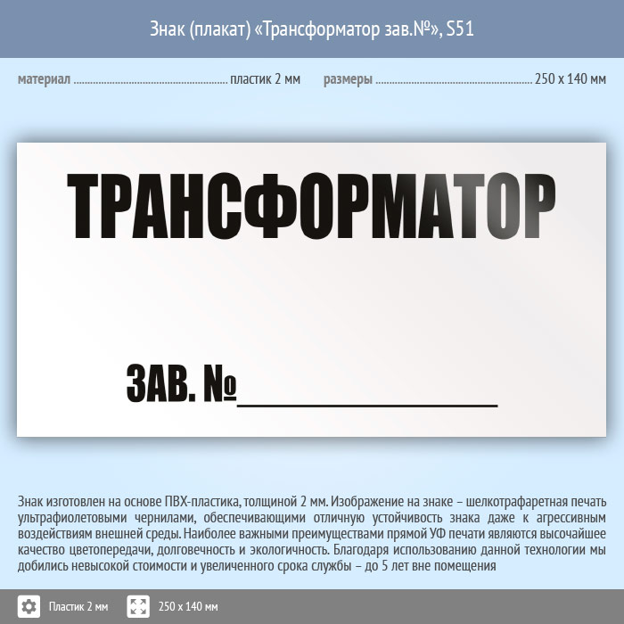 Знак (плакат) «Трансформатор зав.№», S51 (пластик, 250х140 мм) в Нижнекамске купить
