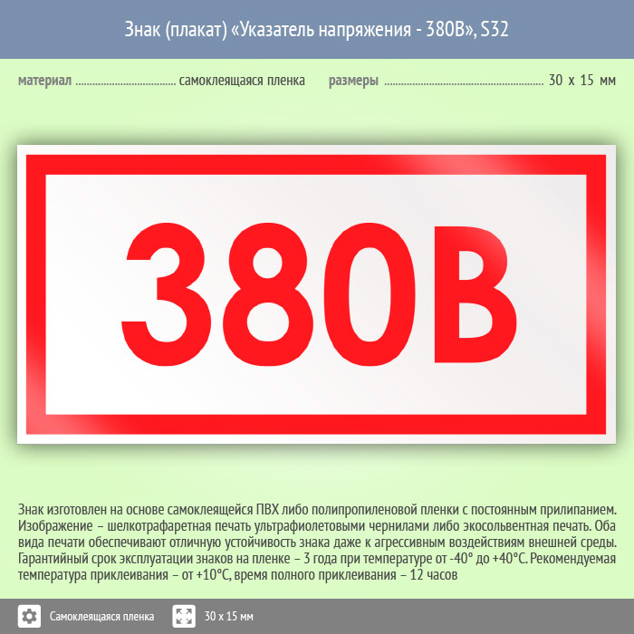 Знак (плакат) «Указатель напряжения - 380В», S32 (50 штук, пленка, 30х15 мм) в Нижнекамске купить