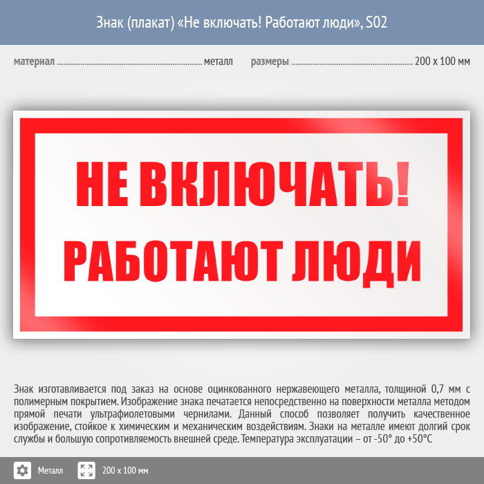 Знак (плакат) «Не включать! Работают люди», S02 (металл, 200х100 мм) в Нижнекамске купить