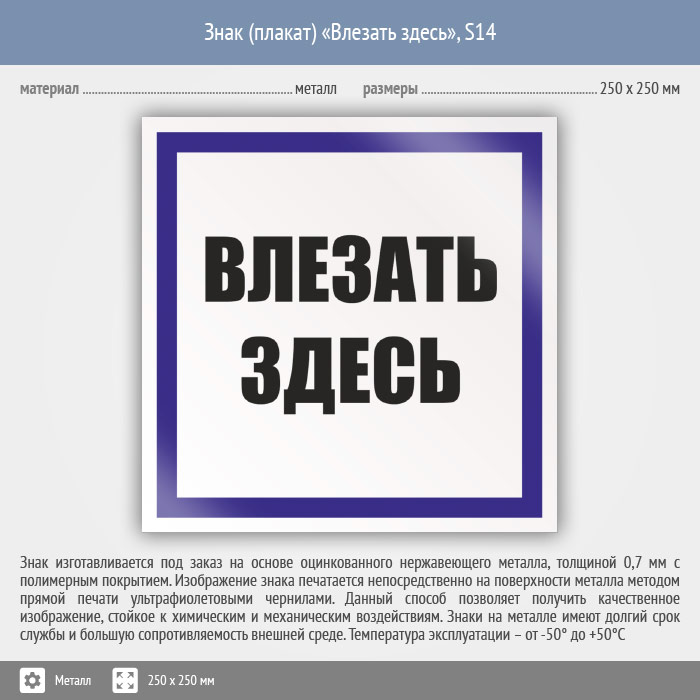 Знак (плакат) «Влезать здесь», S14 (металл, 250х250 мм) в Нижнекамске купить