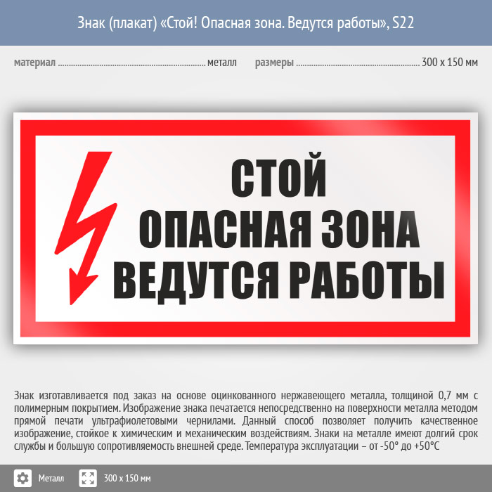 Знак (плакат) «Стой! Опасная зона. Ведутся работы», S22 (металл, 300х150 мм) в Нижнекамске купить