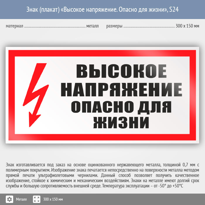 Знак (плакат) «Высокое напряжение. Опасно для жизни», S24 (металл, 300х150 мм) в Нижнекамске купить