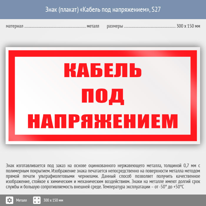 Знак (плакат) «Кабель под напряжением», S27 (металл, 300х150 мм) в Нижнекамске купить