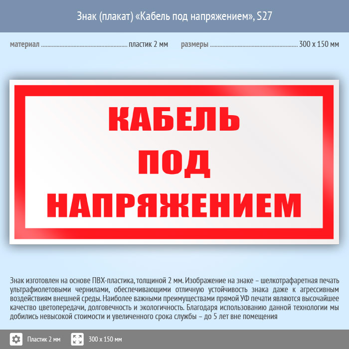Знак (плакат) «Кабель под напряжением», S27 (пластик, 300х150 мм) в Нижнекамске купить