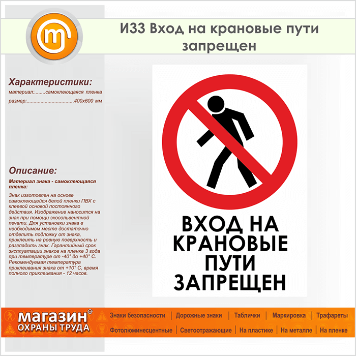 Знак «Вход на крановые пути запрещен», И33 (пленка, 400х600 мм) в Нижнекамске купить