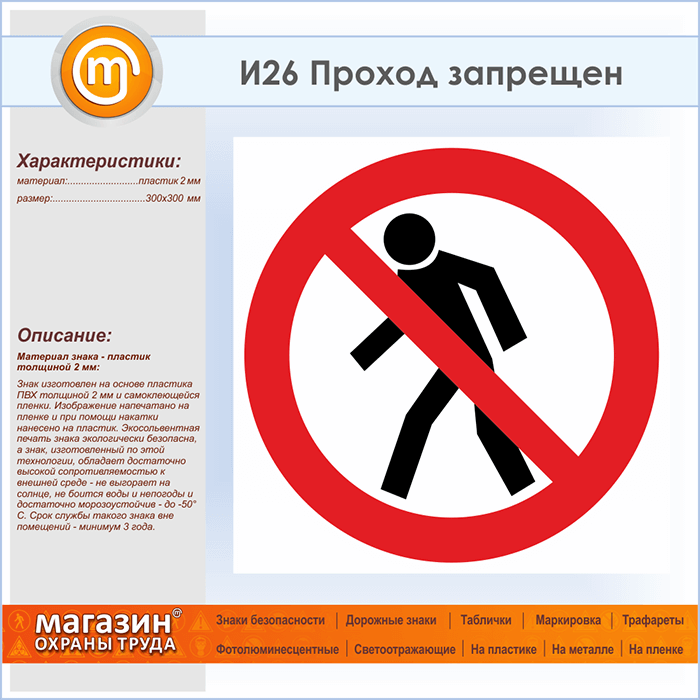 Знак «Проход запрещен», И26 (пластик, 300х300 мм) в Нижнекамске купить