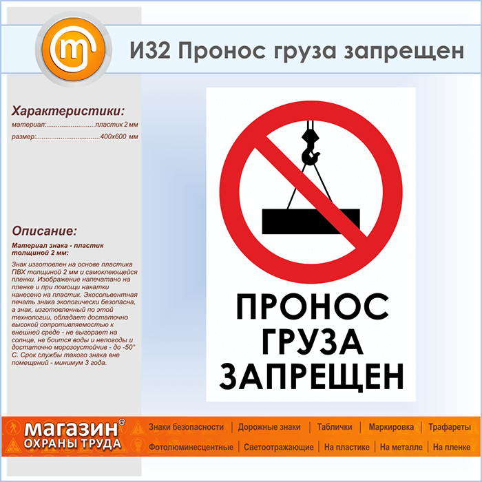 Знак «Пронос груза запрещен», И32 (пластик, 400х600 мм) в Нижнекамске купить