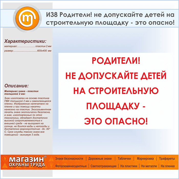 Знак «Родители! не допускайте детей на строительную площадку - это опасно!», И38 (пластик, 600х400 мм) в Нижнекамске купить
