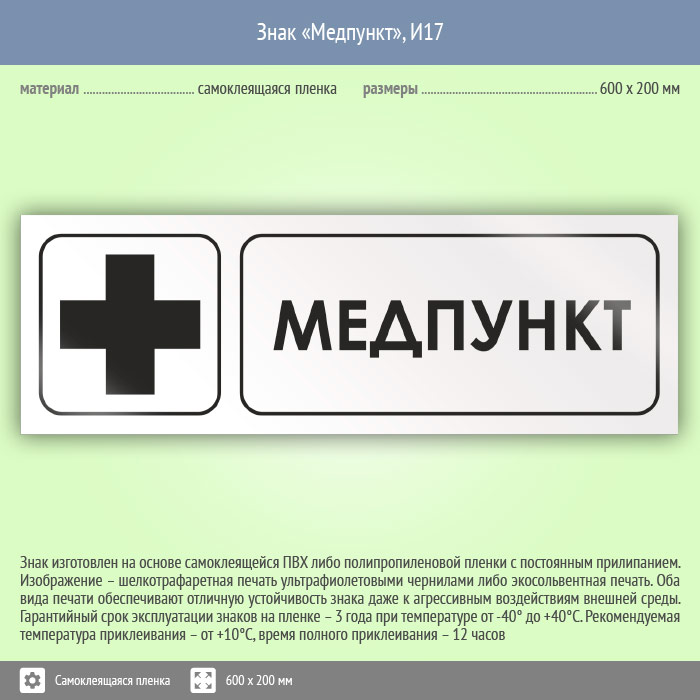 Знак «Медпункт», И17 (пленка, 600х200 мм) в Нижнекамске купить