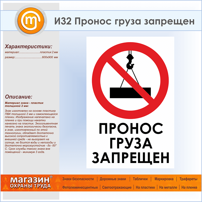 Знак «Пронос груза запрещен», И32 (пластик, 600х900 мм) в Нижнекамске купить