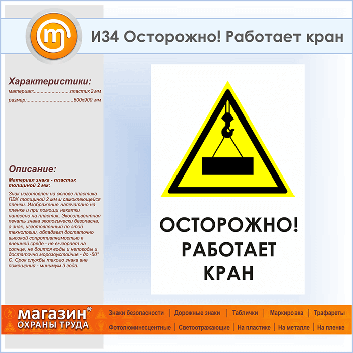 Знак «Осторожно! Работает кран», И34 (пластик, 600х900 мм) в Нижнекамске купить