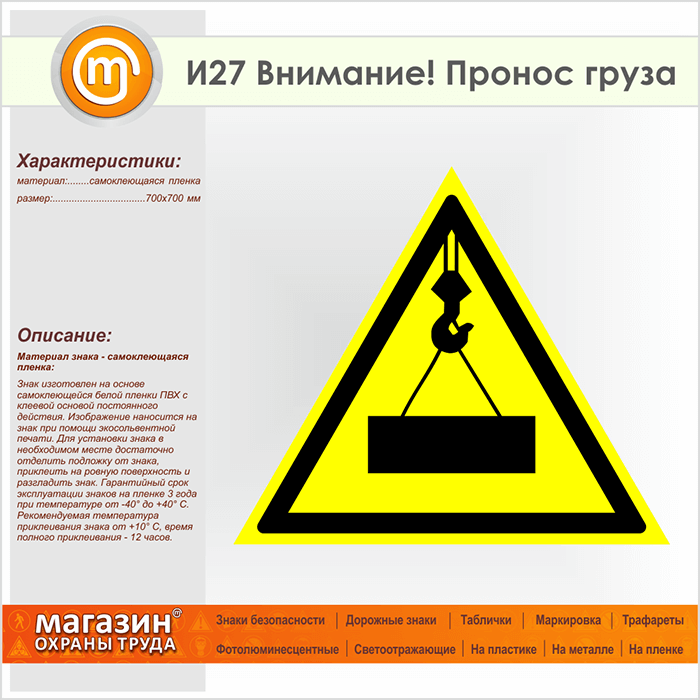 Знак «Внимание! Пронос груза», И27 (пленка, сторона 700 мм) в Нижнекамске купить