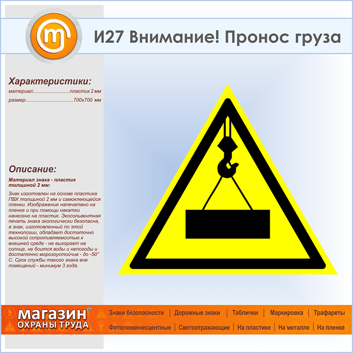 Знак «Внимание! Пронос груза», И27 (пластик, сторона 700 мм) в Нижнекамске купить