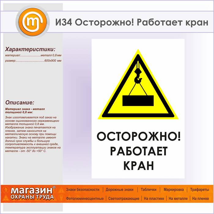 Знак «Осторожно! Работает кран», И34 (металл, 600х900 мм) в Нижнекамске купить