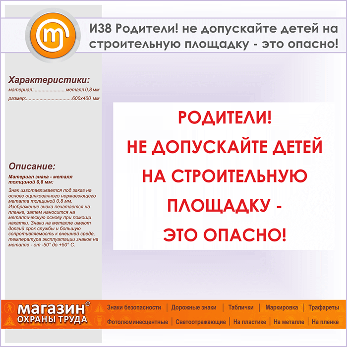 Знак «Родители! не допускайте детей на строительную площадку - это опасно!», И38 (металл, 600х400 мм) в Нижнекамске купить