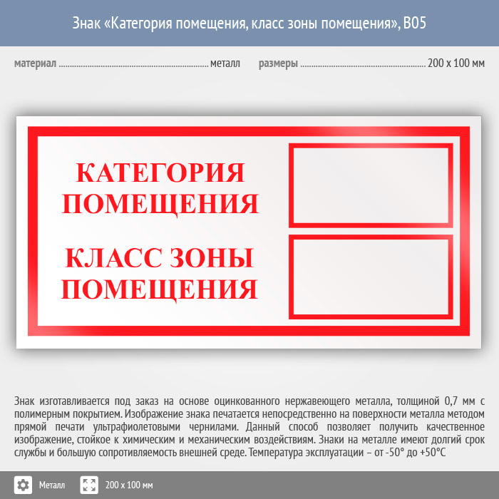 Знак «Категория помещения, класс зоны помещения», B05 (металл, 200х100 мм) в Нижнекамске купить