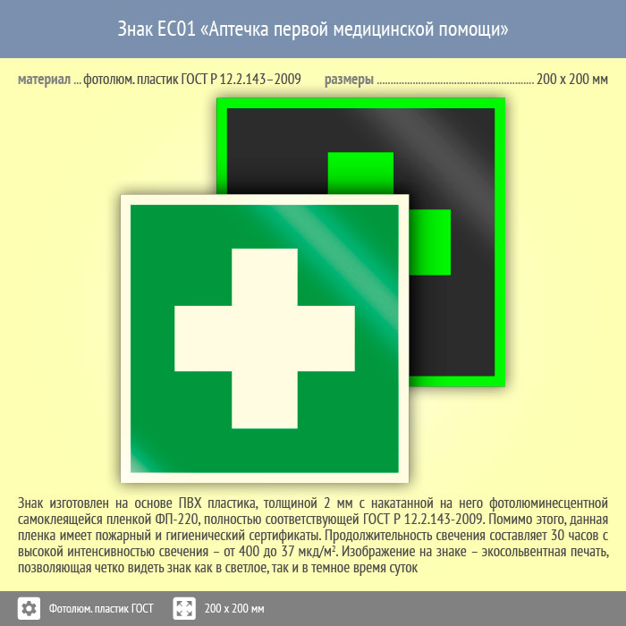 Знак EC01 «Аптечка первой медицинской помощи» (фотолюминесцентный пластик ГОСТ 34428-2018, 200х200 мм) в Нижнекамске купить