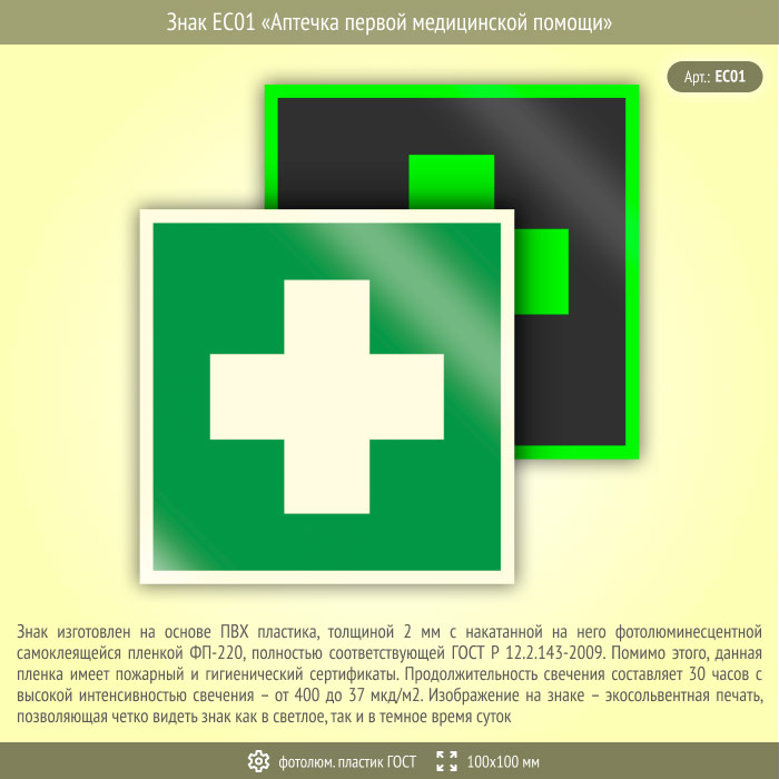 Знак EC01 «Аптечка первой медицинской помощи» (фотолюминесцентный пластик ГОСТ 34428-2018, 100х100 мм) в Нижнекамске купить