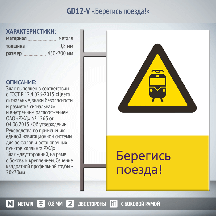 Знак «Берегись поезда!», GD12-V (двусторонний вертикальный, 450х700 мм, металл, на раме с боковым креплением) в Нижнекамске купить
