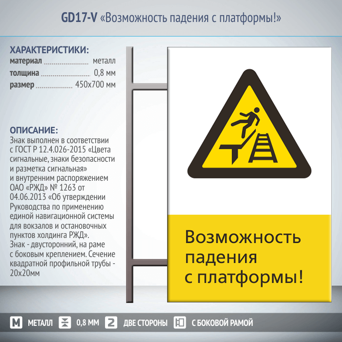 Знак «Возможность падения с платформы!», GD17-V (двусторонний вертикальный, 450х700 мм, металл, на раме с боковым креплением) в Нижнекамске купить