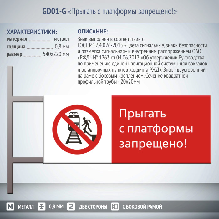 Знак «Прыгать с платформы запрещено!», GD01-G (двусторонний горизонтальный, 540х220 мм, металл, на раме с боковым креплением) в Нижнекамске купить