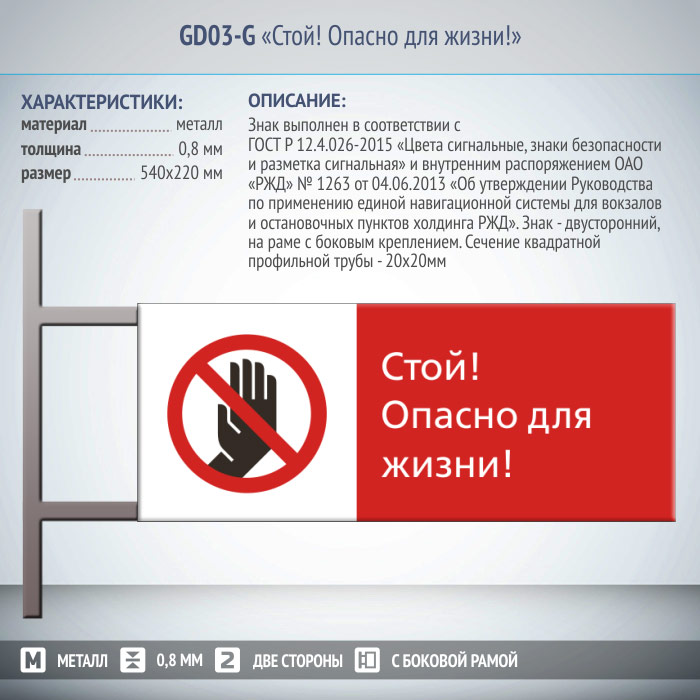 Знак «Стой! Опасно для жизни!», GD03-G (двусторонний горизонтальный, 540х220 мм, металл, на раме с боковым креплением) в Нижнекамске купить