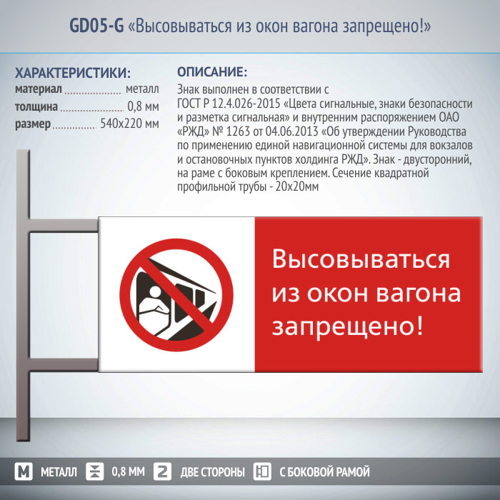 Знак «Высовываться из окон вагона запрещено!», GD05-G (двусторонний горизонтальный, 540х220 мм, металл, на раме с боковым креплением) в Нижнекамске купить
