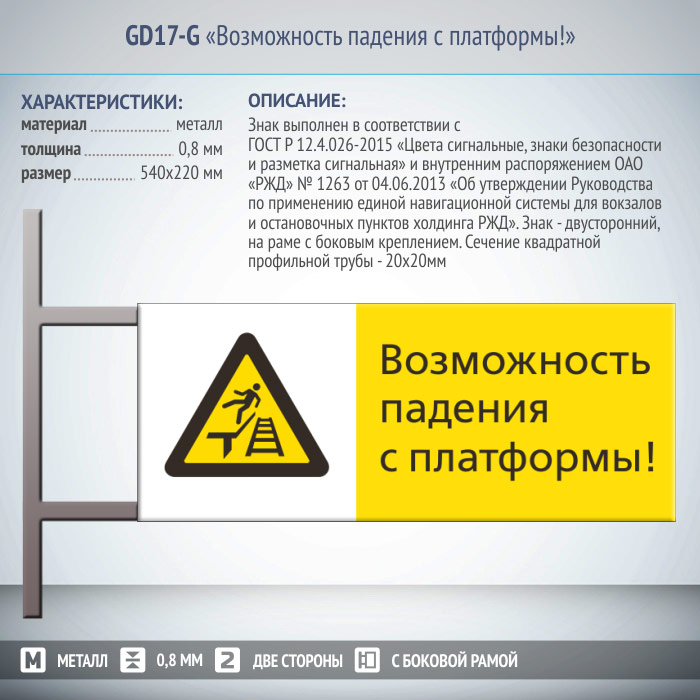 Знак «Возможность падения с платформы!», GD17-G (двусторонний горизонтальный, 540х220 мм, металл, на раме с боковым креплением) в Нижнекамске купить