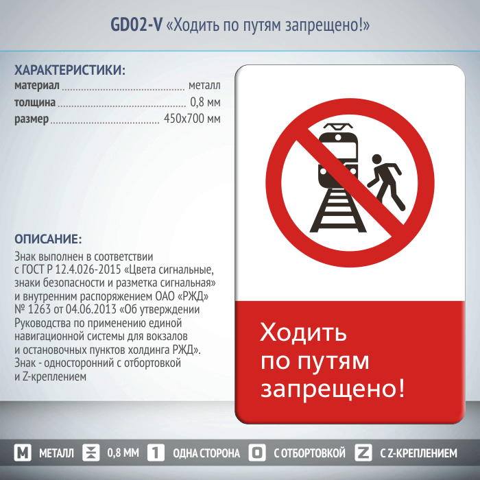 Знак «Ходить по путям запрещено!», GD02-V (односторонний вертикальный, 450х700 мм, металл, с отбортовкой и Z-креплением) в Нижнекамске купить