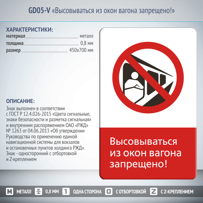 Знак «Высовываться из окон вагона запрещено!», GD05-V (односторонний вертикальный, 450х700 мм, металл, с отбортовкой и Z-креплением) в Нижнекамске купить
