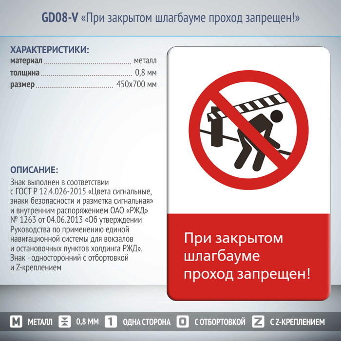 Знак «При закрытом шлагбауме проход запрещен!», GD08-V (односторонний вертикальный, 450х700 мм, металл, с отбортовкой и Z-креплением) в Нижнекамске купить