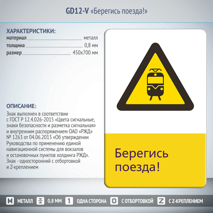 Знак «Берегись поезда!», GD12-V (односторонний вертикальный, 450х700 мм, металл, с отбортовкой и Z-креплением) в Нижнекамске купить