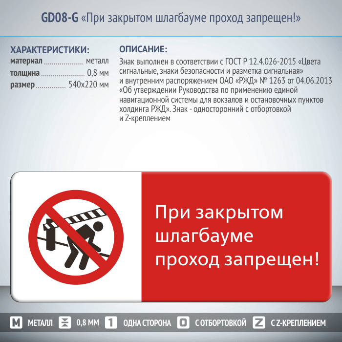 Знак «При закрытом шлагбауме проход запрещен!», GD08-G (односторонний горизонтальный, 540х220 мм, металл, с отбортовкой и Z-креплением) в Нижнекамске купить
