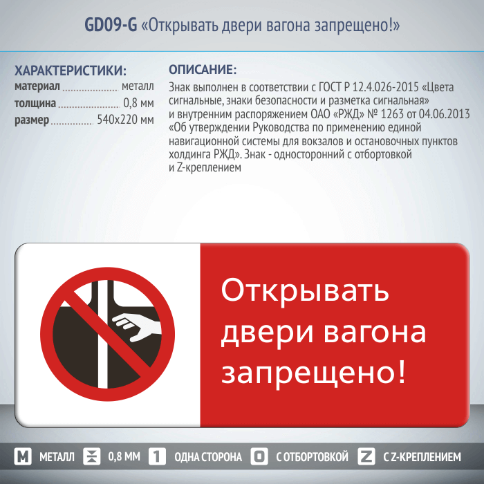 Знак «Открывать двери вагона запрещено!», GD09-G (односторонний горизонтальный, 540х220 мм, металл, с отбортовкой и Z-креплением) в Нижнекамске купить