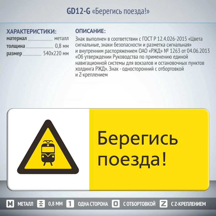 Знак «Берегись поезда!», GD12-G (односторонний горизонтальный, 540х220 мм, металл, с отбортовкой и Z-креплением) в Нижнекамске купить