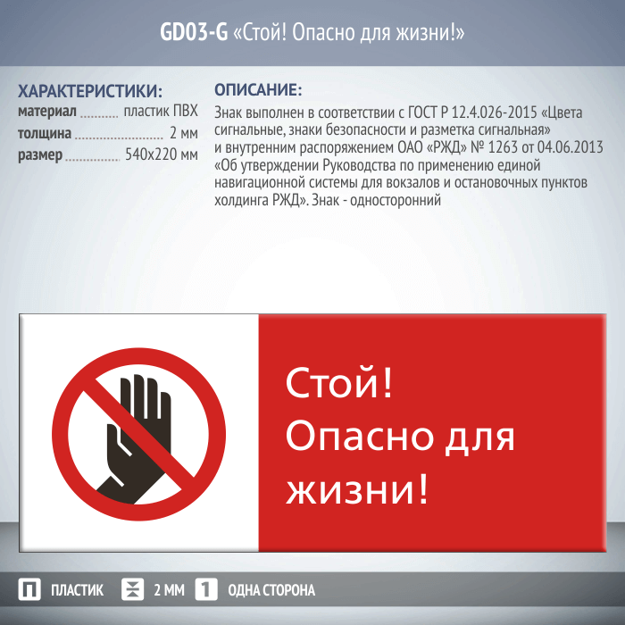Знак «Стой! Опасно для жизни!», GD03-G (односторонний горизонтальный, 540х220 мм, пластик 2 мм) в Нижнекамске купить
