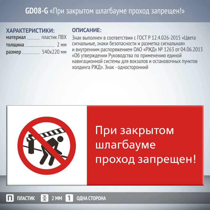 Знак «При закрытом шлагбауме проход запрещен!», GD08-G (односторонний горизонтальный, 540х220 мм, пластик 2 мм) в Нижнекамске купить