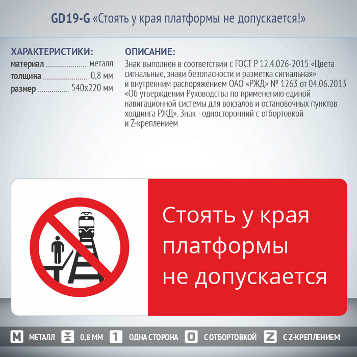 Знак «Стоять у края платформы не допускается!», GD19-G (односторонний горизонтальный, 540х220 мм, металл, с отбортовкой и Z-креплением) в Нижнекамске купить
