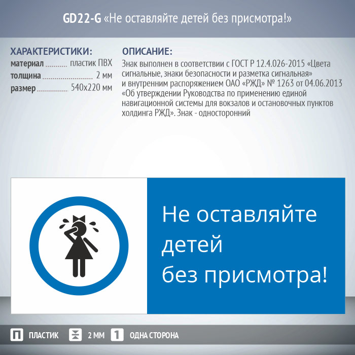 Знак «Не оставляйте детей без присмотра!», GD22-G (односторонний горизонтальный, 540х220 мм, пластик 2 мм) в Нижнекамске купить