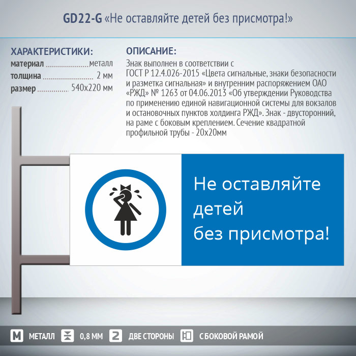Знак «Не оставляйте детей без присмотра!», GD22-G (двусторонний горизонтальный, 540х220 мм, металл, на раме с боковым креплением) в Нижнекамске купить