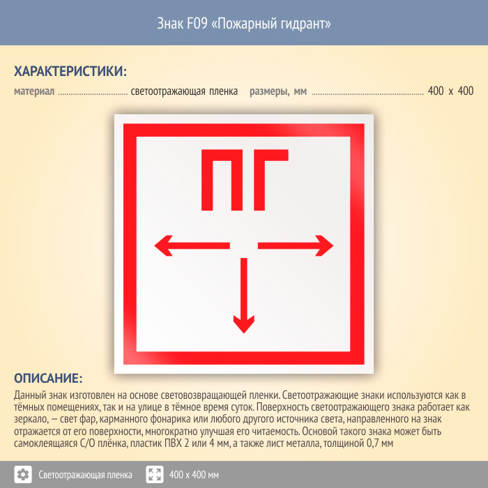 Знак F09 «Пожарный гидрант» (светоотражающая пленка, 400х400 мм) в Нижнекамске купить
