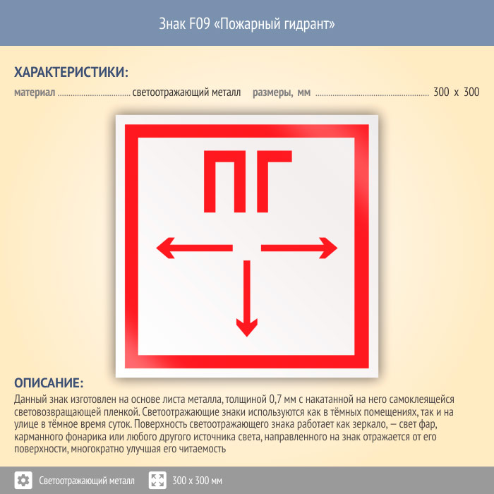 Знак F09 «Пожарный гидрант» (светоотражающий металл, 300х300 мм) в Нижнекамске купить
