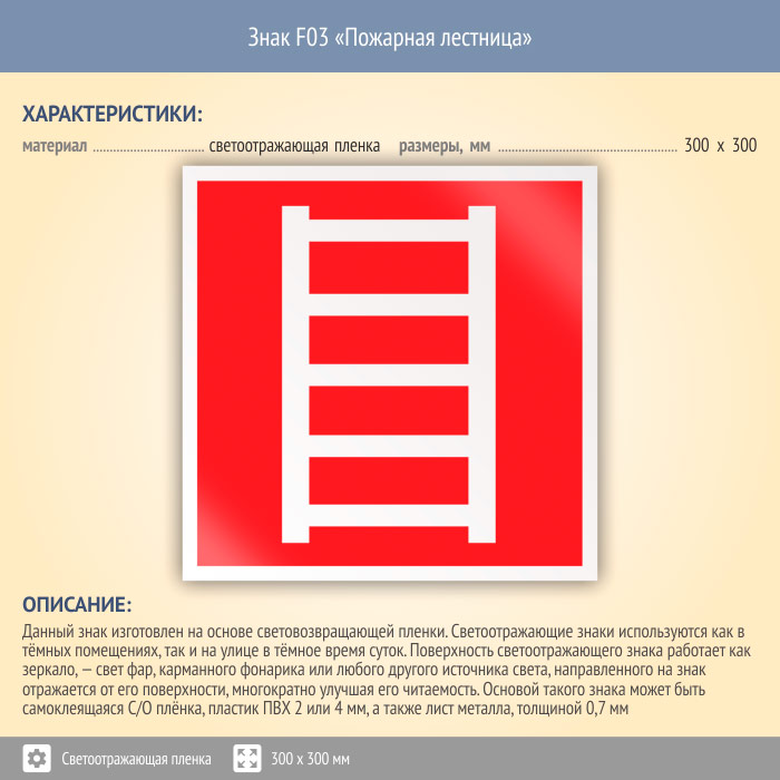 Знак F03 «Пожарная лестница» (светоотражающая пленка, 300х300 мм) в Нижнекамске купить